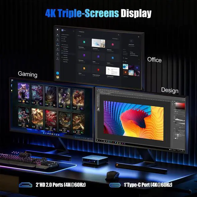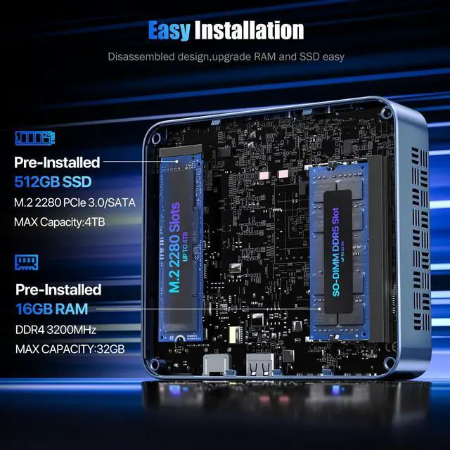 16GB DDR4 & 512GB SSD - Achieve seamless multitasking and fast data access with our mini PC computers, which comes pre-installed with 16GB DDR4 3200MHz RAM (supports expansion up to 32GB) and a 512GB M.2 2280 SSD SATA (compatible with PCIe 3.0 and SATA, expandable up to 4TB), making startup faster and storage management easier.