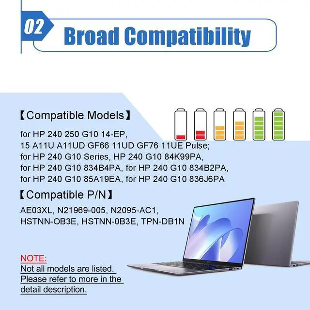 Compatible Laptop Modelsfor HP 240 250 G10 14-EP, 15 A11U A11UD GF66 11UD GF76 11UE Pulse; for HP 240 G10 Series, HP 240 G10 84K99PA, for HP 240 G10 834B4PA, for HP 240 G10 834B2PA, for HP 240 G10 85A19EA, for HP 240 G10 836J6PA, for HP 240 G10 84L00PA, for HP 240 G10 834B3PA, for HP 240 G10 834B5PA, for HP 240 G10 834U9PA, for HP 240 G10 836M6PA,for HP 240 G10 836J8PA Series; for HP 14-EE 14-EE0000 Series; for HP 14-EM 14-EM0000 Series; for HP 14-EP 14-EP0000 Series; for HP 15-FC 15-FC0000 Series; for HP 15-FD 15-FD0000 Series