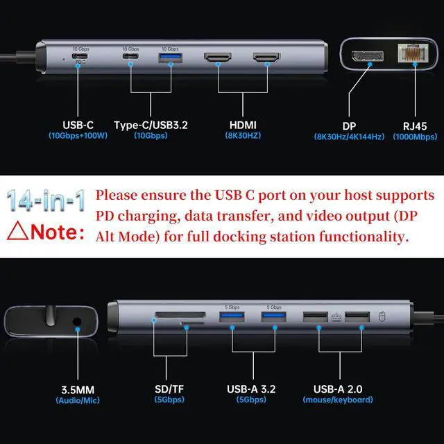14 in 1 USB Dock: Turn one of your laptops USB-C port into 14 with two 8K HDMI port, a 8K DisplayPort, two10Gbps USB-C data ports(One port with 100W power delivery), a 10Gbps USB-A data port, two 5Gbps USB A data ports, two 480Mbps USB-A data ports, a 1Gbps Ethernet port, a 3.5mm Mic/Audio port, and microSD / SD card slots, all ports can work simultaneously