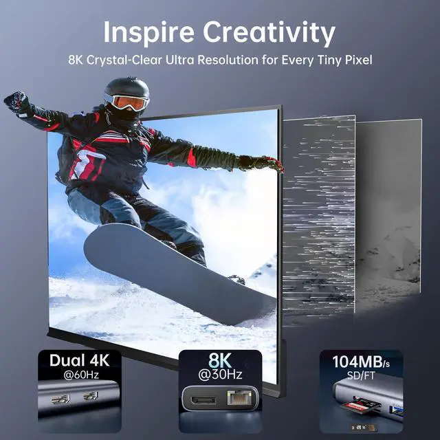 8K HDMI & DP: This usb c displayport hub dual HDMI and DP port with ultra chip supports 8K30Hz. Backward compatible with 4K60Hz, 4K30Hz, 2K60Hz, 1080P120Hz, mirror or extend your screen to monitor, projector or HDTV at crystal-clear resolution