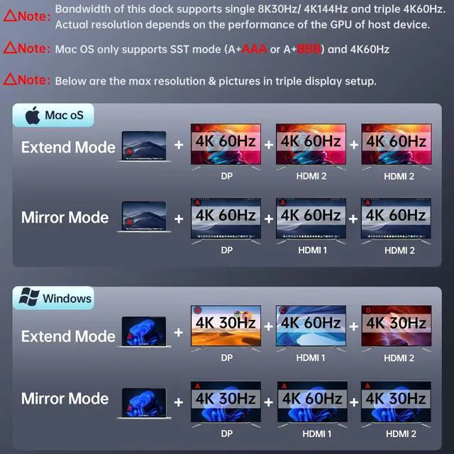 Triple Display: Thunderbolt usb c docking station 3 monitors supports 3* 4K60Hz max at extend mode. Actual resolution depends on the performance of the graphic cards (GPU) of host PC. *due to Apple's limitation, Mac OS doesn't support extending mode, and consequently, all external screens will be the same in SST mode (A+AAA or A+BBB)
