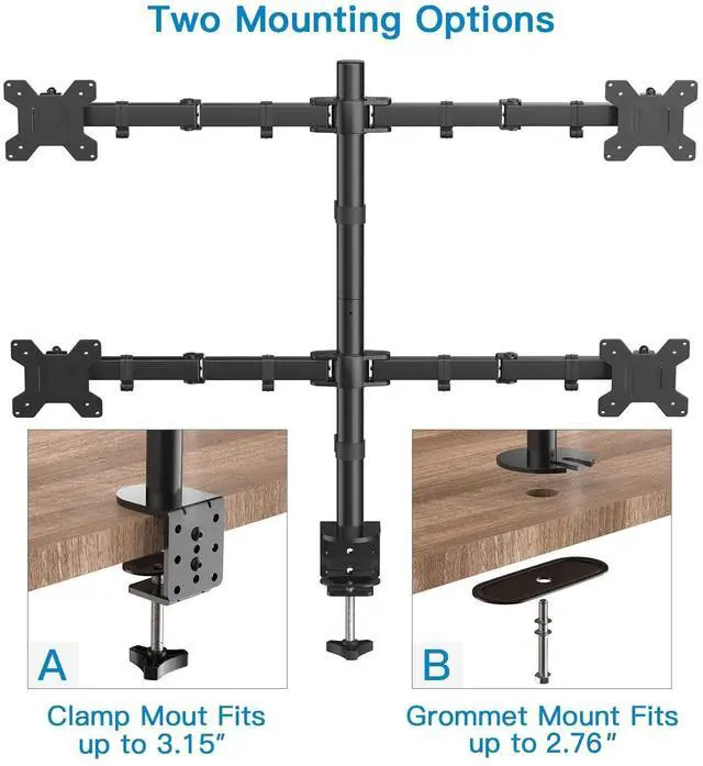 Dual Mount Options- The quad monitor stand supports both C Clamp mounting (for desk thickness up to 3") and grommet mounting(fits desks with thickness up to 3.15").