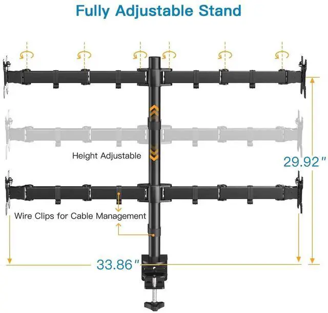 Height Adjustment and Clear up Desk Space - The quad monitor stand is easily adjustable on a 31.5 height pole. Hold 4 monitors on this quad monitor mount, saving space on your workstation and enhancing work efficiency.