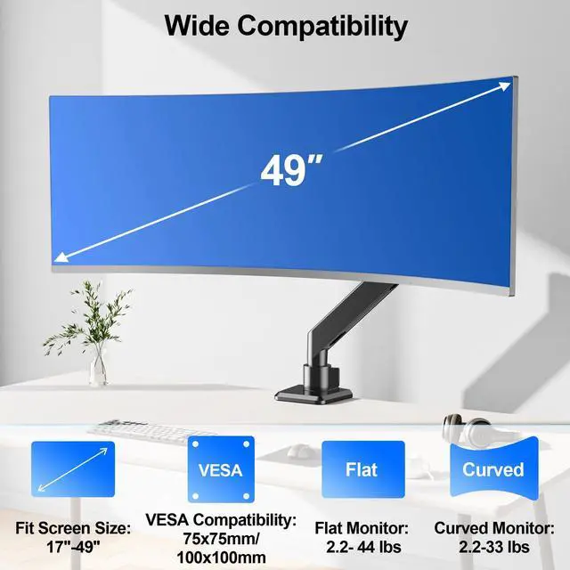 Exceptional Weight Capacity - Fits up to 49" ultrawide screens. ErgoFocus heavy duty monitor arm can handle most 13"- 49" flat and curved monitors with VESA 75x75mm or 100x100mm, supports curved screens weighing 2.2-33 lbs and flat screens weighing 2.2- 44 lbs. Compatible with Samsung Odyssey G9, LG, Dell, ASUS, Acer, MSI, HP, Sceptre, and other ultrawide monitors, covers common sizes such as 49", 43", 42", 39", 38", 35", 34", 32", 27", 24", 22" screen