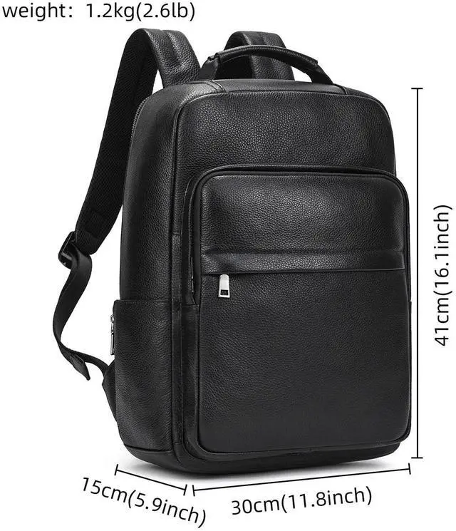 Large Capacity: Size 16.1"(H) x 11.8" (L) x 5.9" (W). Weight: 1.2kg/2.6lb. Inner structure:1 big open pocket, 1 laptop pocket, 1 zipper pocket, 1 small open pocket; Outer structure: 2 zipper pocket, 1 side small open pocket, 1 expandable side water bottle holder pocket. This casual leather backpack is big enough to carry on 14 inch laptop and many essentials like ipad, A4 files, notesbooks, umbrella, wallet, water bottle etc.