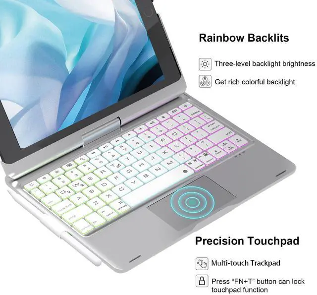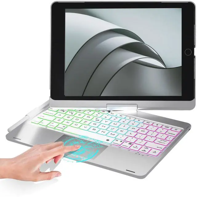 Multiple Viewing Angles -360 swivel & 180 flip keyboard case for iPad 9th generation, Make your iPad screen will have multiple viewing angles. Easily adjusts to whatever comfortable angle suits you best. You can display your work presentation, watch your favorite show or read a new book. Its also a great helper to do homework. Practical and lightweight to carry out.