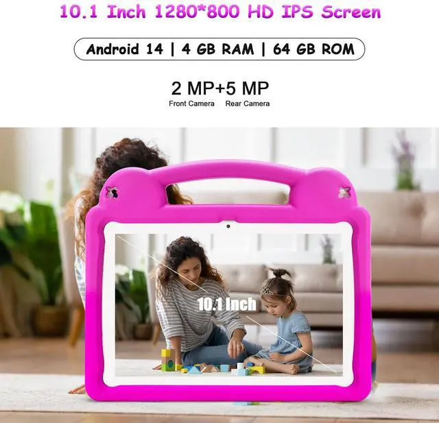 [10.1 Inch HD IPS Display Touch Screen] The 10 inch tablet for kids boasts a 1280x800 IPS HD touchscreen employing low blue light technology. With expansive viewing angles and vibrant colors, it effectively safeguards your childs vision. Featuring 4GB RAM, 64GB ROM, IPS HD display (1280x800), WiFi 6, a robust 5000mAh battery, and google mobile services, this android 14 tablet housed in a shockproof case with a stand, promises an immersive and feature-rich experience for your kids.