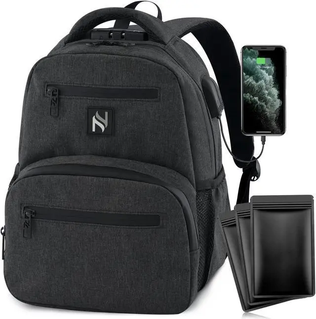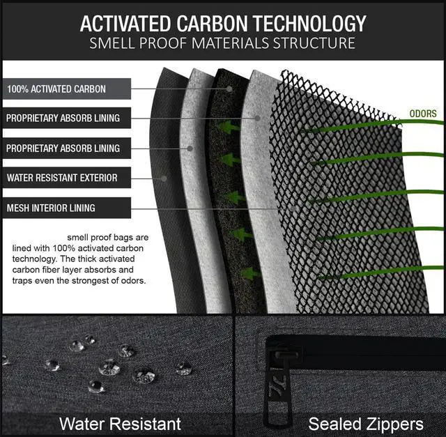 100% SMELL PROOF - Activated Carbon Technology. We use a carbon filter that surrounds the entire bag to make this the ultimate smell proof backpack for your glass and accessories. You can transport your items safely and discreetly thanks to the carbon filter system used in this bag. Smell proof storage to put your mind at ease. WEATHER RESISTANT MATERIALS WATER PROOF COMBINATION LOCK - For Maximum Protection And Discretion. With a Fixed Combo Lock and Durable Metal Zippers, it is safe guaranteed for protecting your valuable items inside. Travel confidently knowing your items are secure and no unwanted smells are sneaking out.