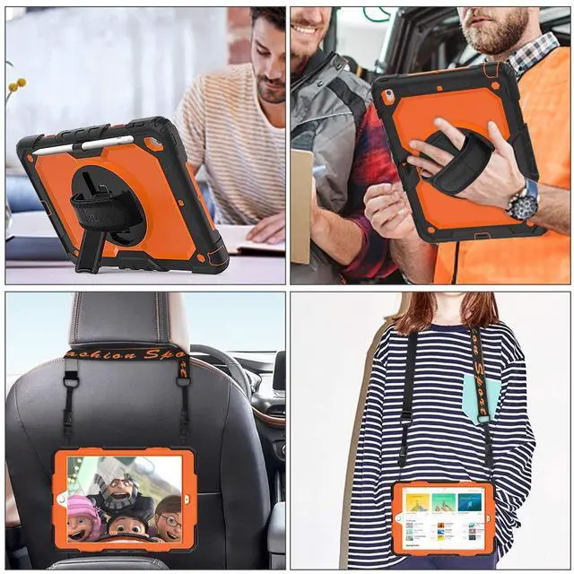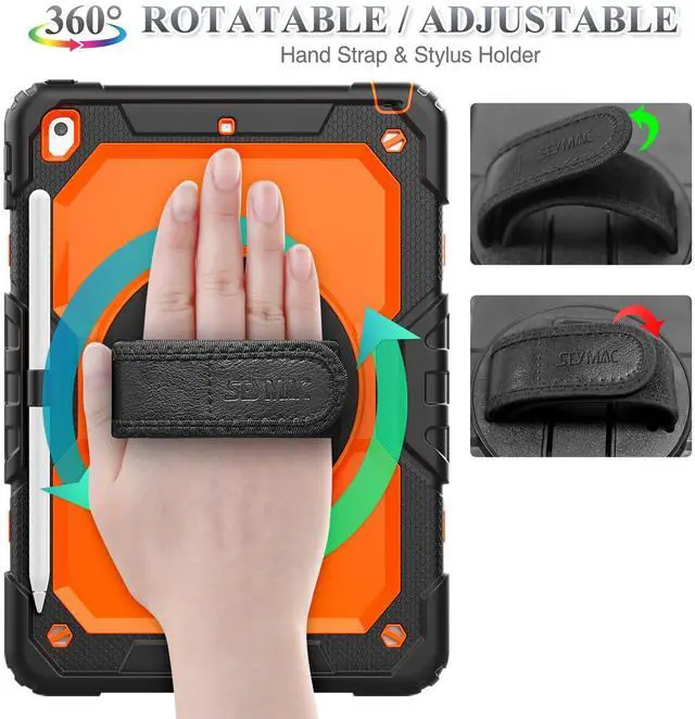 SEYMAC stock Case for iPad 9th/ 8th/ 7th Generation 10.2 '', Shockproof with Screen Protector, Pencil Holder [360° Rotating Hand Strap] & Stand, for iPad 10.2 inch 2021-2019 (Brightorange)