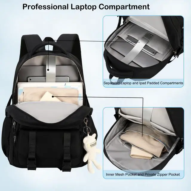 Large Size & Giveaway: The size of stylish student backpack for school is 13.8"x7.5"x17.8"(L*W*H), Weight:1.65 LB. The laptop bag compartment come with laptop protective tape and have multi compartments with a separate ipad compartment(fit up to 11.3 inch ipad) and a separate computer compartment(fit up to 17 inch lap top). This big schoolbag for teenager also along with backpack ornaments(a white plush soft bear doll key pendant)as accessories makes the bags more fashionable and unique.