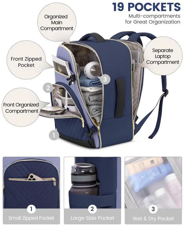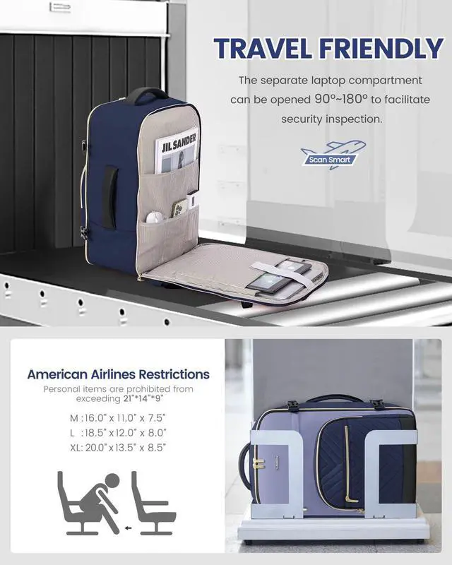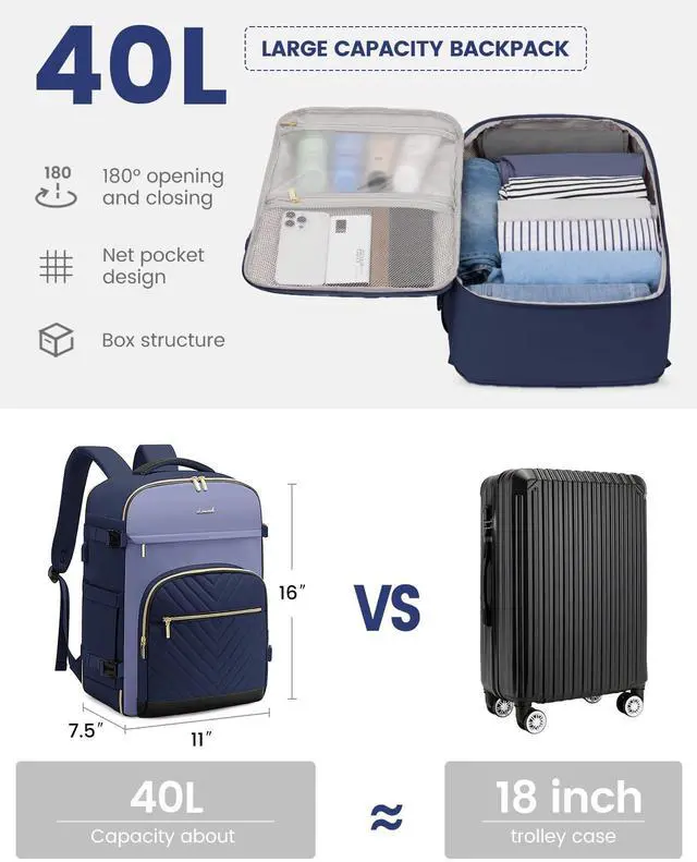 This large women's travel backpack combines a 40-liter capacity with a multifunctional design to meet the needs of 3-6 day trips, while also featuring conveniences designed for air travel, such as a TSA-friendly layout and dimensions that comply with the standards of multiple airlines, ensuring both style and practicality during your journey. Made from durable, waterproof polyester, the backpack not only offers excellent breathability and heat dissipation but also provides an anti-theft pocket and various carrying options, making it an ideal choice for business trips, outdoor adventures, or daily commutes.