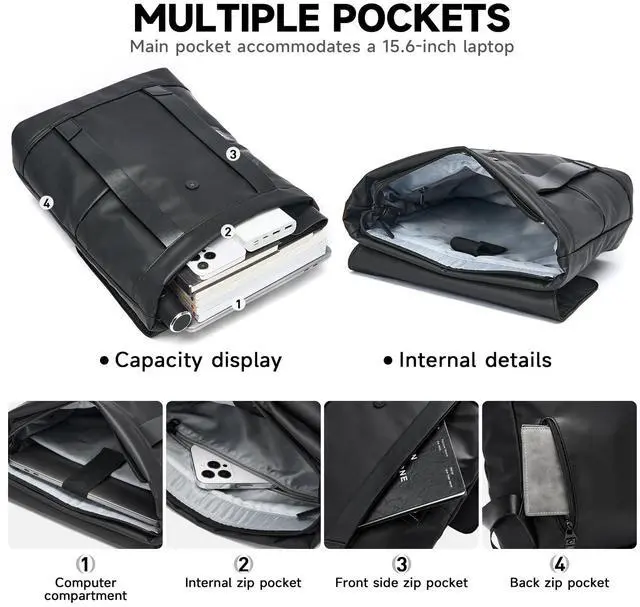 Check out the MATE ELAN laptop backpack! Its material combo of waterproof microfiber leather, durable ballistic nylon and strong metal zippers resists daily wear and water. Ideal for work or weekend trips. The 11.4L * 5.1W * 16.9H size suits 15.6 -inch laptops and iPads. The main pocket has a front zip for quick access, a rear anti-theft one, and an internal small pocket. The soft flannel laptop sleeve protects your device. With fine tailoring, waterproof back and adjustable straps, it's comfy all day. Thickened leather on the bottom, handle and straps, plus 3D design, enhances style and durability.