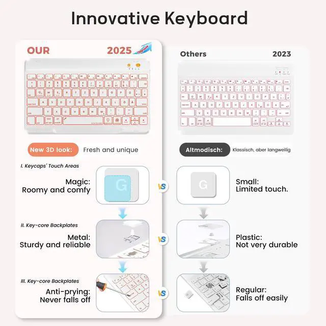 Rechargeable Backlit Keyboard7-color backlit and wireless keyboard allows you to type comfortably even in low light conditions. Use a USB-C charging cable to ensure long-term use.Shortcut keys make it easier for you to use your device.
