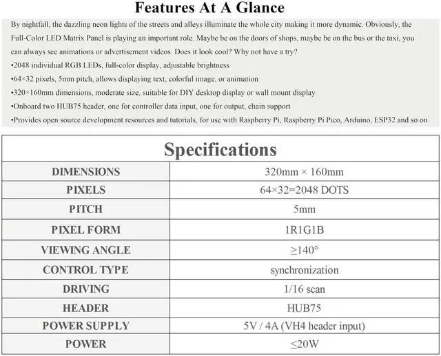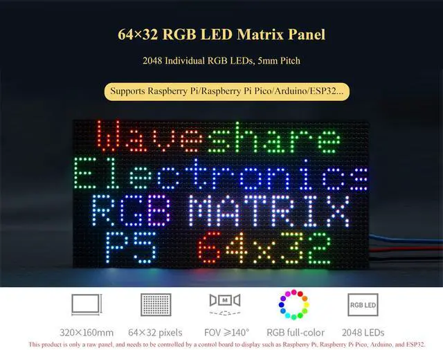 Note: It is only a Raw Matrix Panel, and it needs to be controlled by a control board to display, which is Compatible with Raspberry Pi 5/4B/3B+/3B/Zero 2 W/Zero W/Zero/Pico/Pico W/Pico 2/Pico 2 W/ ESP32, Ar-dui-no