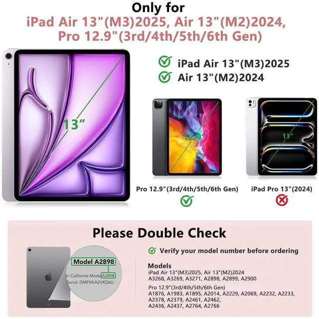 Compatibility: Compatible with iPad Air 13 inch (M3) 2025(Models:A3268/A3269/A3271), For iPad Air 13 inch (M2) 2024(Models:A2898/A2899/A2900), For iPad Pro 12.9 inch 6th Generation 2022(Model:A2436/A2437/A2764/A2766), For iPad Pro 12.9 inch 5th Generation 2021(Model:A2378/A2379/A2461/A2462), For iPad Pro 12.9 inch 4th Generation 2020(Model:A2229/A2069/A2232/A2233), For iPad Pro 12.9 inch 3rd Generation 2018(Model:A1876/A1983/A1895/A2014). Not for any other models. Please check the model number No. "AXXXX" the bottom of the back of your tablet to confirm correct size before purchasing