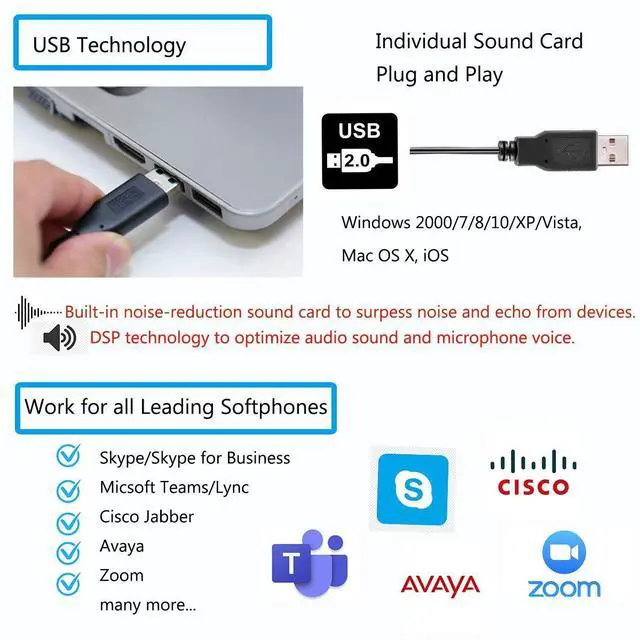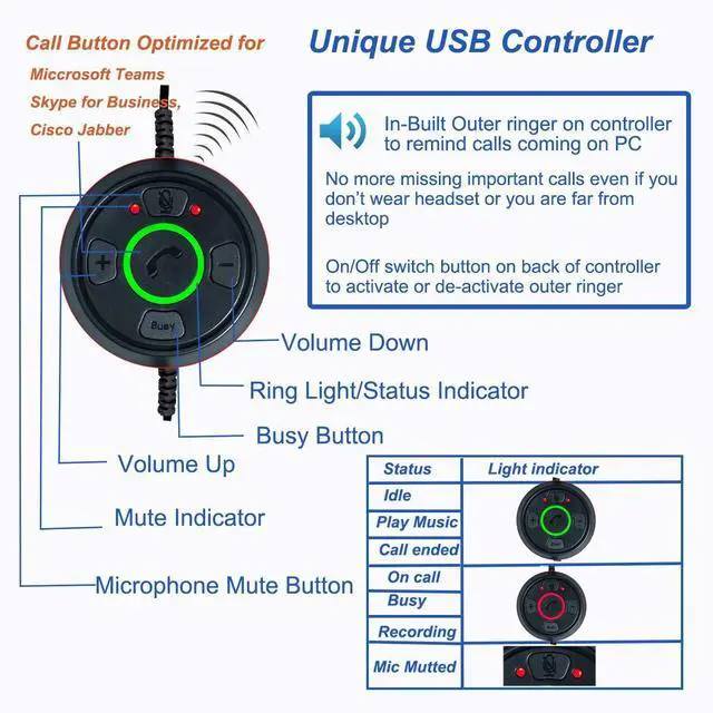 Calls Coming Reminder & Easy Access Control: Plug and play PC headset with outer ringer on control box, you can easily know calls are coming on PC without wearing headset. With in-line busy light to indicate you are on calls or busy that you dont to be disturbed. Volume button to increase/decrease volume, Mic mute to mute and un-mute microphone. With call button to answer and end calls, optimized for Microsoft Teams and Cisco Jabber.