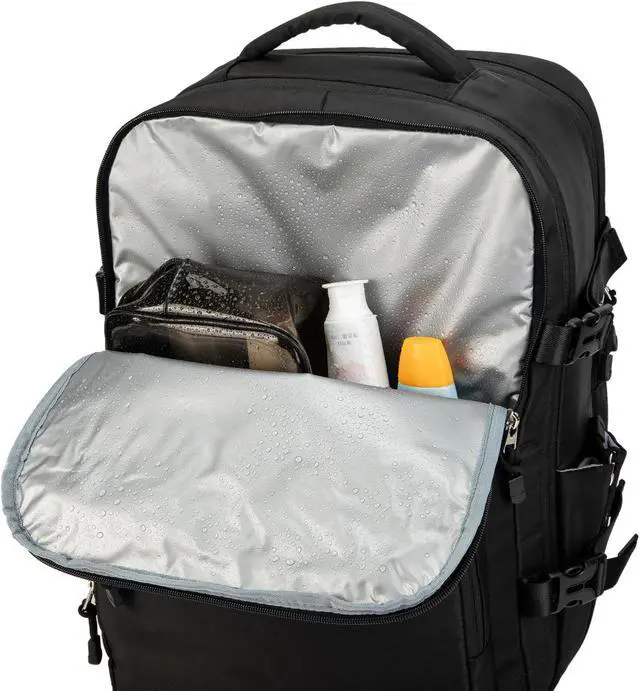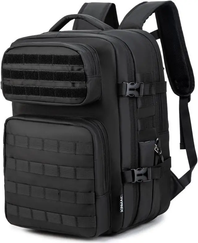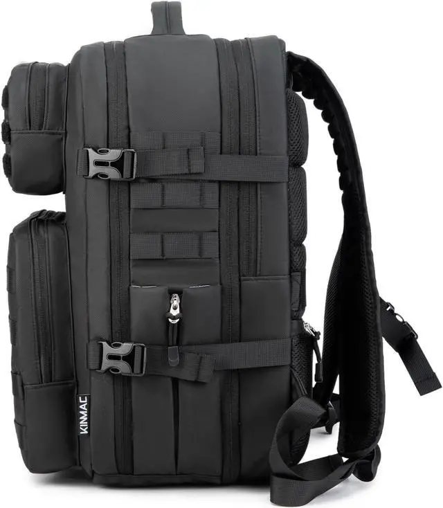 This Kinmac Travel Backpack is perfect for business trips, weekend getaways, and daily use. It is made of high quality polyester fabric with a water-resistant exterior, making it durable and stylish. The backpack has a capacity of 40 liters and can hold a 17-inch laptop, making it suitable for work. The backpack features multiple compartments, including a dedicated laptop compartment, a pocket for documents, and a pocket for accessories. It also has a comfortable padded shoulder strap and a top handle for easy carrying. The backpack is easy to clean and is a great choice for anyone looking for a durable and stylish travel backpack.