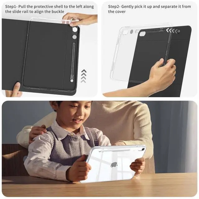 Full Protection: Detachable HD transparent back case can be placed vertically or horizontally, multi-angle usage can be switched at will. Hardshell back cover with flexible TPU bumper protects your iPad from shocks, drops and impacts. Soft microfiber interior front prevents your tablet from scratched. And the crystal clear back cover can fully display your iPad color and logo.