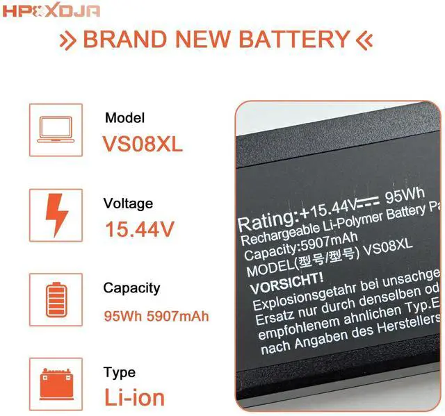 Battery Specifications VS08XL battery for HP. Battery Type: Li-ion. Capacity: 95Wh 5907mAh. Voltage: 15.44V. WHAT YOU GET: 1 * VS08XL battery. 1 * User Manual. 4 * Screwdrivers.