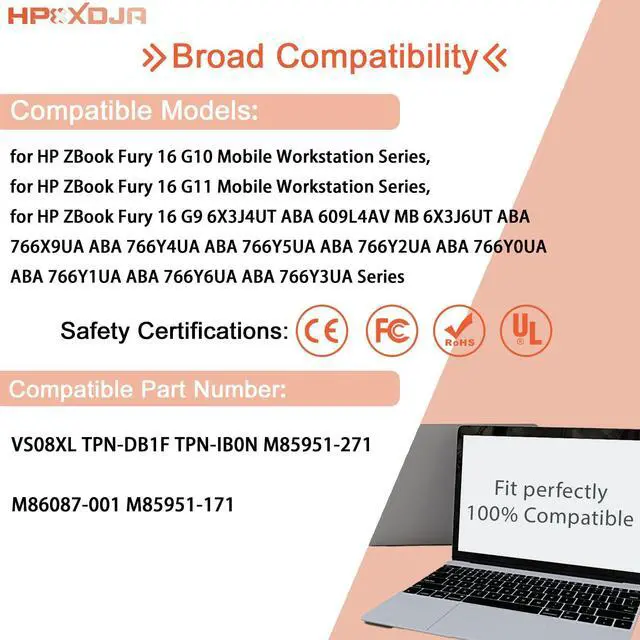 Compatible with VS08XL battery. Replacement for HP ZBook Fury 16 G10 Mobile Workstation Series, for HP ZBook Fury 16 G11 Mobile Workstation Series, for HP ZBook Fury 16 G9 6X3J4UT ABA 609L4AV MB 6X3J6UT ABA 766X9UA ABA 766Y4UA ABA 766Y5UA ABA 766Y2UA ABA 766Y0UA ABA 766Y1UA ABA 766Y6UA ABA 766Y3UA Series.