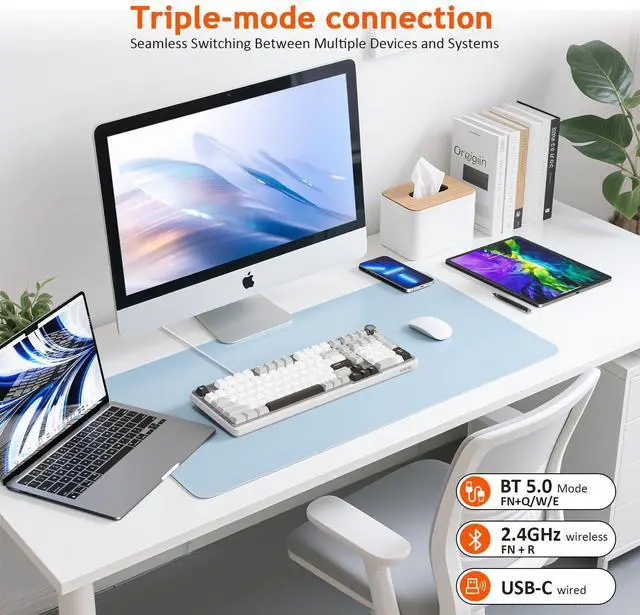 [Triple-Mode Connectivity] - Experience seamless switching across Bluetooth 5.0, 2.4GHz wireless, and wired USB-C connections. The Bluetooth mode supports pairing with up to three devices simultaneously, enabling efficient multitasking for work or gaming.