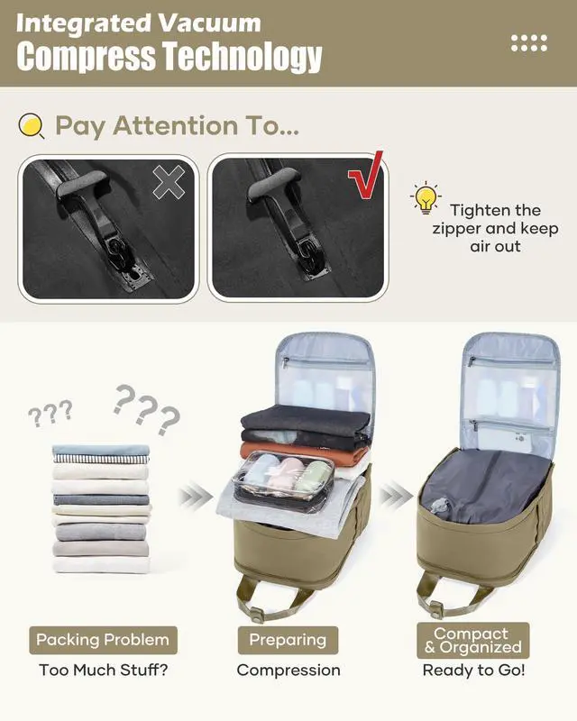 hapfoxx Vacuum Travel Backpack with Pump, Personal Item Carry on Backpacks Flight Approved 18x14x8 inches Women, Laptop Waterproof Work Compression bags hiking Casual Daypack Grey Brown