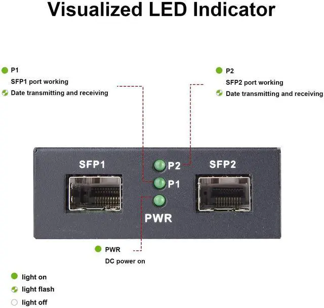 Modulization configuration design, support hot-swappable, plug and play. LED indicators for P1, P2, POWER can dynamic feedback link connection state and fault detection to easily monitor network status. NOT support PON.