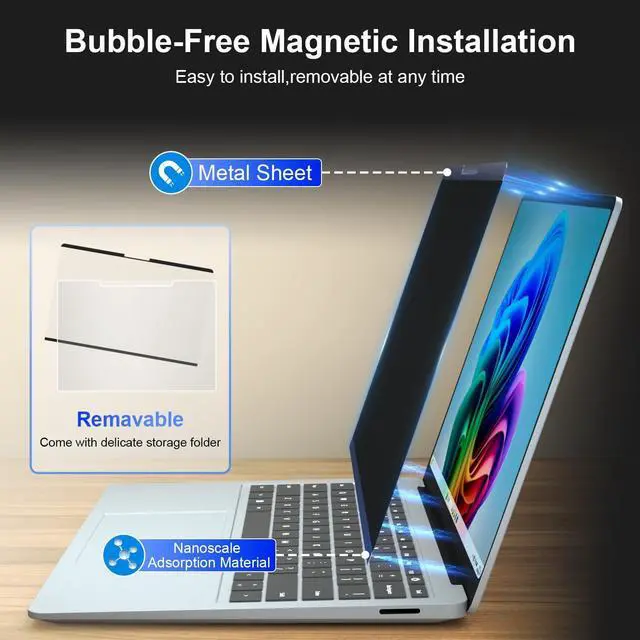 Newly Enhanced & UpgradedWe have innovated the installation method of the surface laptop 13.5 privacy screen film, using the bottom nano suction and the top magnetic suction installation method. Installs in a second. The removable, washable design will allow the surface laptop privacy screen to be reused and look new every day.