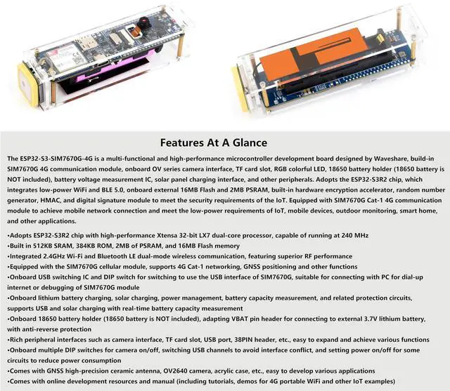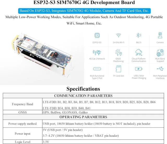 The ESP32-S3-SIM7670G-4G is a multi-functional and high-performance microcontroller development board, build-in SIM7670G 4G communication module, onboard OV series camera interface, TF card slot, RGB colorful LED, 18650 battry holder (18650 battry is NOT included), battry voltage measurement IC, solar panel charging interface, and other peripherals.
