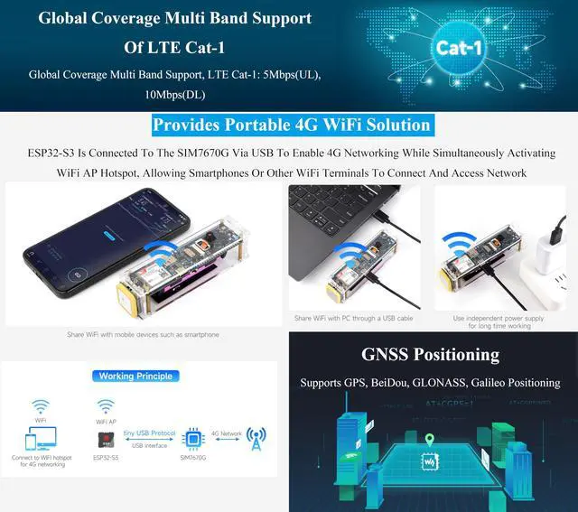 Equipped with the SIM7670G cellular module, supports 4G Cat-1 networking, GNSS positioning and other functions. Global Coverage Multi Band support of LTE Cat-1. G