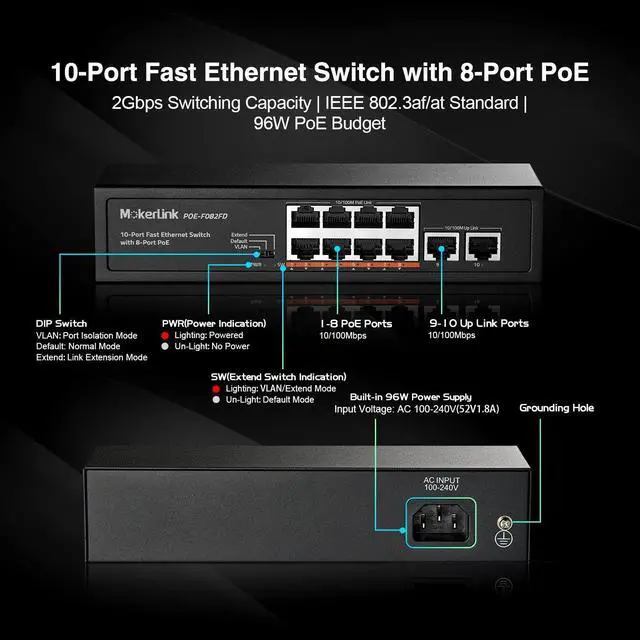MokerLink 10 Port PoE Switch With 8 Port PoE+, 2 Fast Ethernet Uplink, 100Mbps, 96W 802.3 af/at, Fanless Plug & Play Ethernet Switch