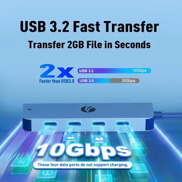 10Gbps Data TransferUSB C splitter move files to and from your laptop at speeds of up to 10 Gbps via the USB-C data ports. Thats fast enough to transfer a 20 GB file in just 16.4 seconds. We recommend connecting one or 2 external USB hard drive, SSD drives at a time. NOTE: All Ports Not Support Monitor.