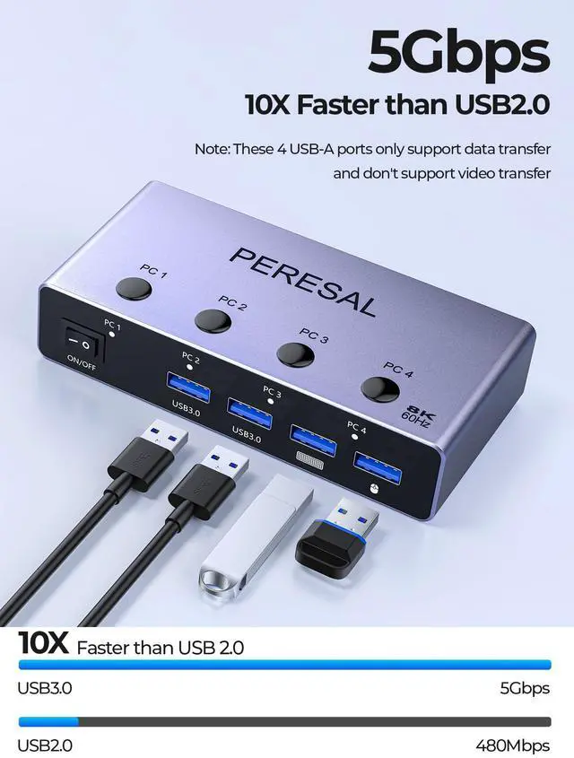 UHD 8K@60Hz This KVM switch 4K@240Hz supports resolution up to 8K@60Hz and backward compatible 4k@60Hz. PERESAL USB Switch also supports HDMI 2.0 and HDCP 2.3, 3D and HDR, which makes images display more exquisite and realistic, color is more bright and moving