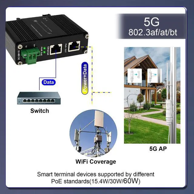 5G PoE Injector - Industrial 5 Gigabit IEEE802.3bt 60W Hardened POE Adapter with 12-48V DC Input DIN- Rail, IP40 Aluminum Case, for 5G Router/AP/Extender