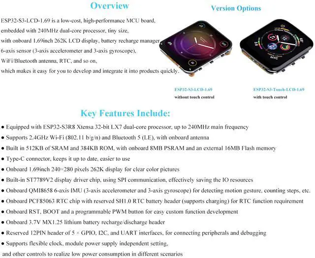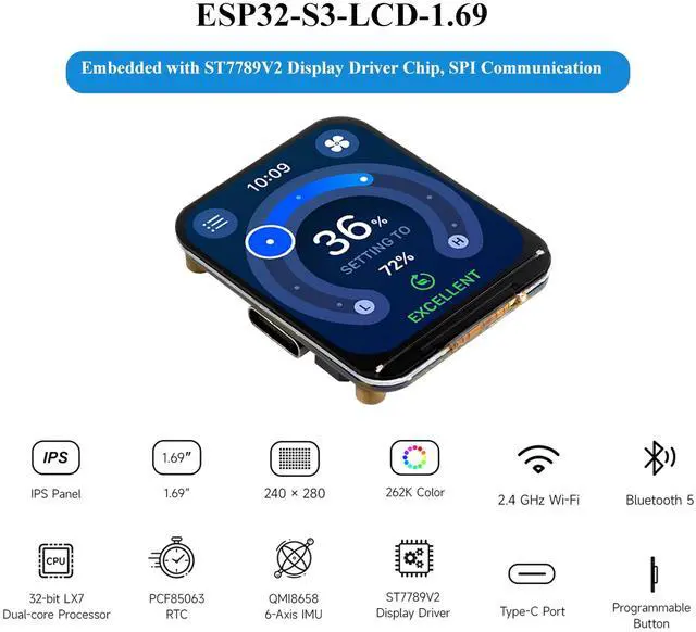 ESP32-S3-LCD-1.69 is a high-performance MCU board designed by Waveshare. ESP32-S3 Development Board with 1.69inch Display Development Board, 32-Bit 240MHz LX7 Dual-Core Processor, 240×280 Pixels, Supports W-iF-i/Blue-too-th, Compact size, Accelerometer And Gyroscope Sensor.