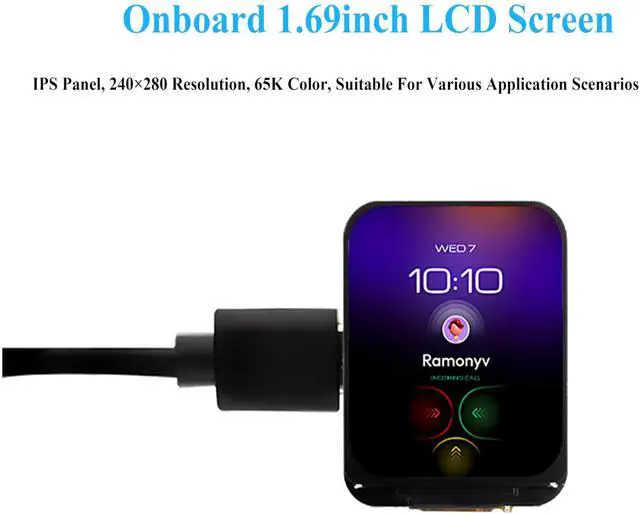 Onboard 1.69inch LCD Screen, IPS Panel, 240×280 Resolution, 65K Color, Suitable for various application scenarios. Type-C connector, keeps it up to date, easier to use.