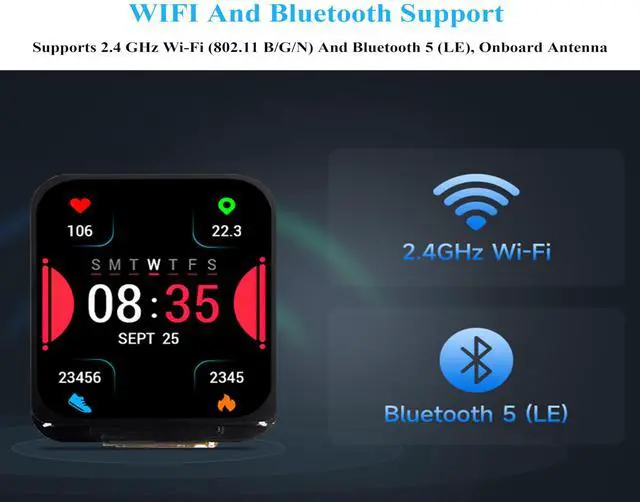 Supports 2.4GHz W-i-F-i (802.11 b/g/n) and Blue-too th 5 (LE), with onboard antenna.