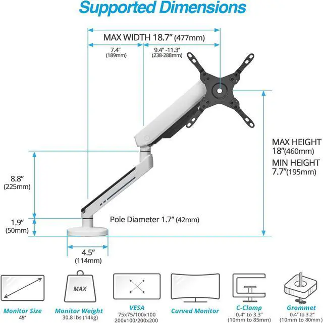 Fits 27" to 45" Screens: Single monitor desk mount supports flat, curved, or ultrawide monitors up to 30.8 lbs (14 kg); compatible with VESA 75x75 mm, 100x100 mm, 200x100 mm, or 200x200 mm mounting patterns.