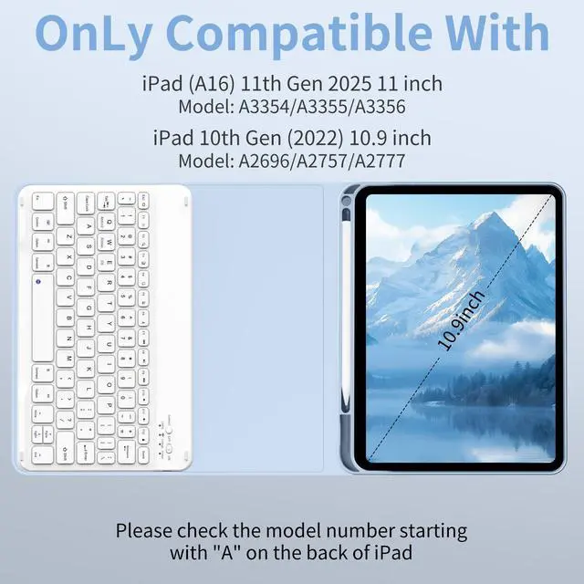 Compatibility Model: This iPad wireless keyboard case is designed for iPad 11th Generation 2025 11 inch Case with Keyboard( Model: A3354/A3355/A3356 ) and iPad 10th Generation 2022 10.9 inch. ( Model: A2696/A2757/A2777 ). NOT compatible with any other iPad models. Please check back bottom of your iPad to find the model number