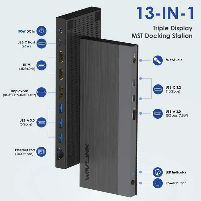 WAVLINK USB C Docking Station Dual Monitor Triple Display USB Type C to Dual HDMI Dock, 2 HDMI, DisplayPort, 100W PD 3.0 for Laptop, Ethernet, 4 USB 3.0, 2 USB C, Audio