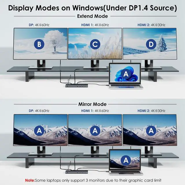 8K Ultra HD & Triple Display: Take your visual experience to the next level with our USB C dock. Equipped with dual HDMI and DP ports, it supports up to triple 4K@60Hz video output for Mac users (Under DP1.4). Single 8K@30Hz is only available for Windows PC via the DisplayPort. Ideal for video editors, image designers, game players etc. NOTE: Some Windows laptops only support 3 monitors(including the host screen) due to their graphic card limitations. Mac OS supports extending the display to a single external monitor only