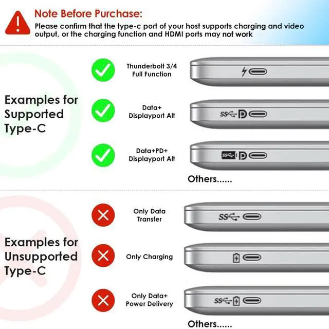 13-in-1 Docking Station: Plug and play, comes with 2xUSB-C 3.2 ports, 4xUSB-A 3.0 ports, 2x4K HDMI, 1x8K DisplayPort, Gigabit Ethernet port, upstream USB-C port, 3.5mm audio jack, 1x DC port. Allows your PC to connect various peripherals with only one cable connected to the docking station, greatly improving productive efficiency. NOTE: Ensure the host's Type-C port supports video output functionality, as non-compliant ports might not work as expected