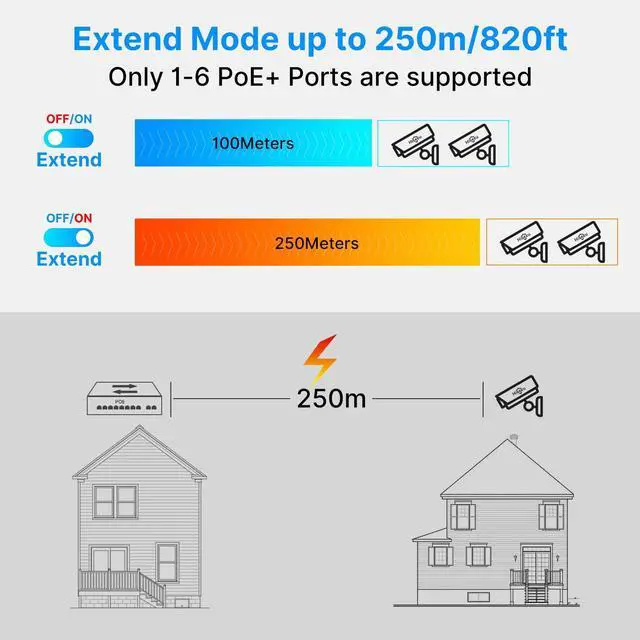 Extend to 250M & 1000/100/10 MbpsThe Hiseeu PoE Switch includes 2 Gigabit Ports(1000 Mbps) and 8 PoE + ports. When in the default mode, the transfer speed is up to 100 Mbps within 100m (328 ft), but if the extend mode is on, the transfer distance can reach up to 250m (820ft)