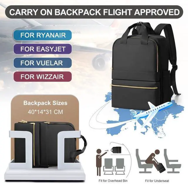 Multiple Pockets: This airplane travel backpack has 2 side pockets for folding umbrellas or smaller water bottles, a separate computer pocket designed for laptops up to 15.6 inches, and 2 front zippered pockets for storing small items.