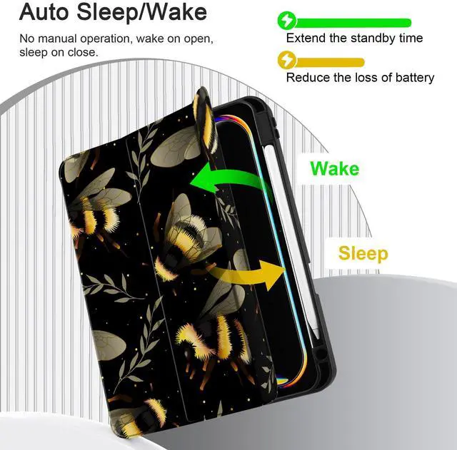 MEEgoodo Case for M4 iPad Pro 11 inch Case 2024, Tablet Cover with Trifold Stand & Pencil Holder & Auto Wake/Sleep & Soft TPU Back Cover, Bumblebee & Leaves