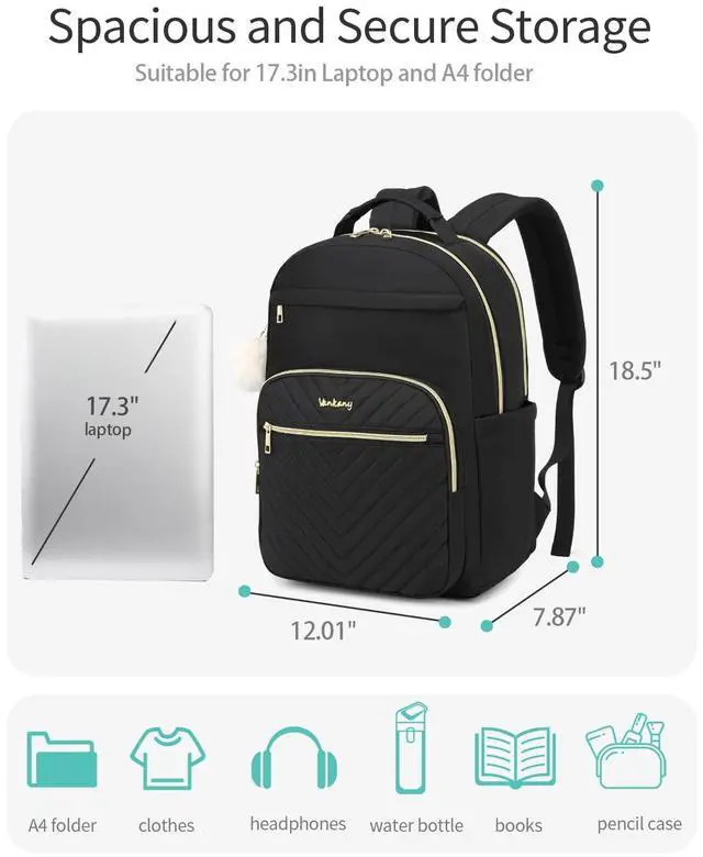 Spacious Interior: Featuring a separate padded laptop compartment that holds and protects a 16 / 17 inch laptop, ensuring your tech stays safe on the go. The large main compartment is roomy for daily necessities, such as folders, text books, lunch box and electronic. Quick access front pockets are perfect for keeping all of your smaller items secure. On the outside, it has two expandable water bottle pockets and a back anti-theft pocket for secure storage