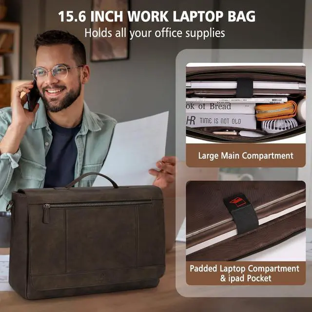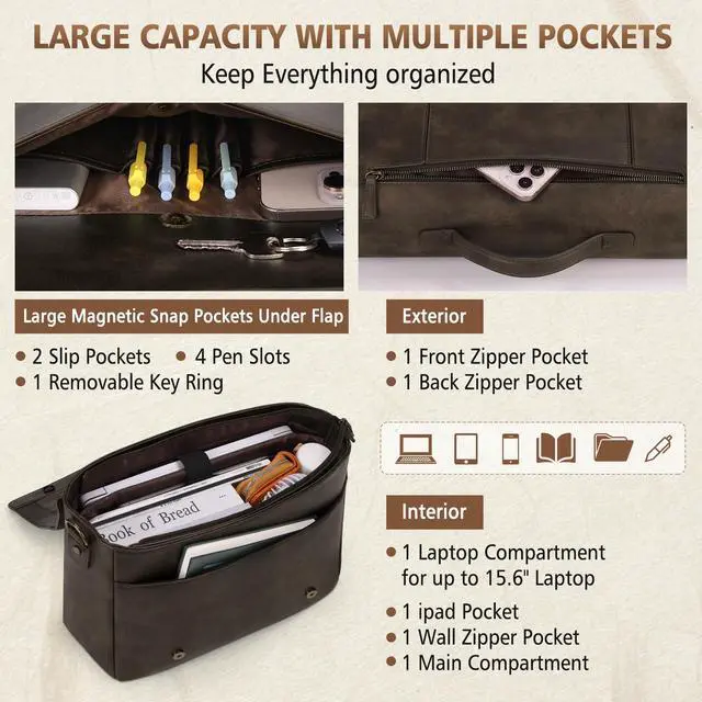 PROFESSIONAL WORK BAG: The Main compartment of the messenger bag for men is equipped with a padded laptop compartment that fits for laptop up to 15.6 inches;1 iPad pocket and 1 wall zipper pocket. Under the flap of the leather messenger bag, there is a large magnetic snap pocket(with 4 pen slots,2 slip pockets, and a removable keychain). The exterior of the leather laptop bag for men features a front zipper pocket and a back zipper pocket for easy access