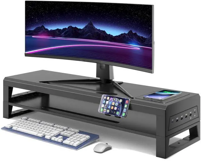 Upgrade your workspace with the GECKOSTROLL Dual-Layer Monitor Riser, a premium all-metal shelf system designed to enhance performance, comfort, and organization. Measuring 715mm in length and 220mm in width, this dual-tier riser provides spacious support for dual monitors, laptops, or desktop essentials. Built with a metal center shelf and sturdy ABS legs, it boasts an impressive 90kg load capacity. The integrated wireless charging pad and versatile USB hubfeaturing USB-A, USB-C for both charging and datamake it the ideal all-in-one desktop solution. Keep your phone visible and accessible with the included detachable stand, and enjoy a cleaner, more focused workspace.