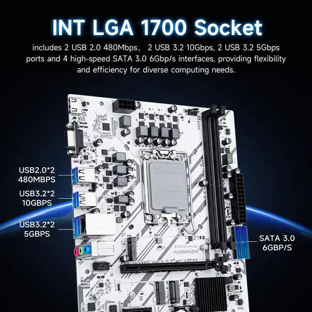 Computer Motherboard, HUANANZHI B760M-VH-B Micro-ATX Gaming PC MotherboardDDR4 64G, SATA3.0 6Gbps, USB3.2 10Gbps, HD-MI2.0, PCIE 4.0 INT LGA 1700 Motherboard for PC Computer Desktop, White