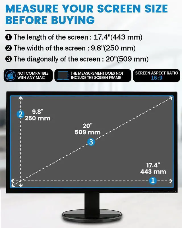 Compatible Model Width: 17 7/16"(443mm), Height: 9 13/16" (250mm), Diagonal: 20" (559 mm) . This anti glare computer screen cover 20 inch monitor is compatible with Sceptre/ YOTETION/ Kado/ SKitphrati/ DELL/ AOC/ 20" computers with 16:9 aspect ratio. Before ordering, make sure your screen size matches the protector size